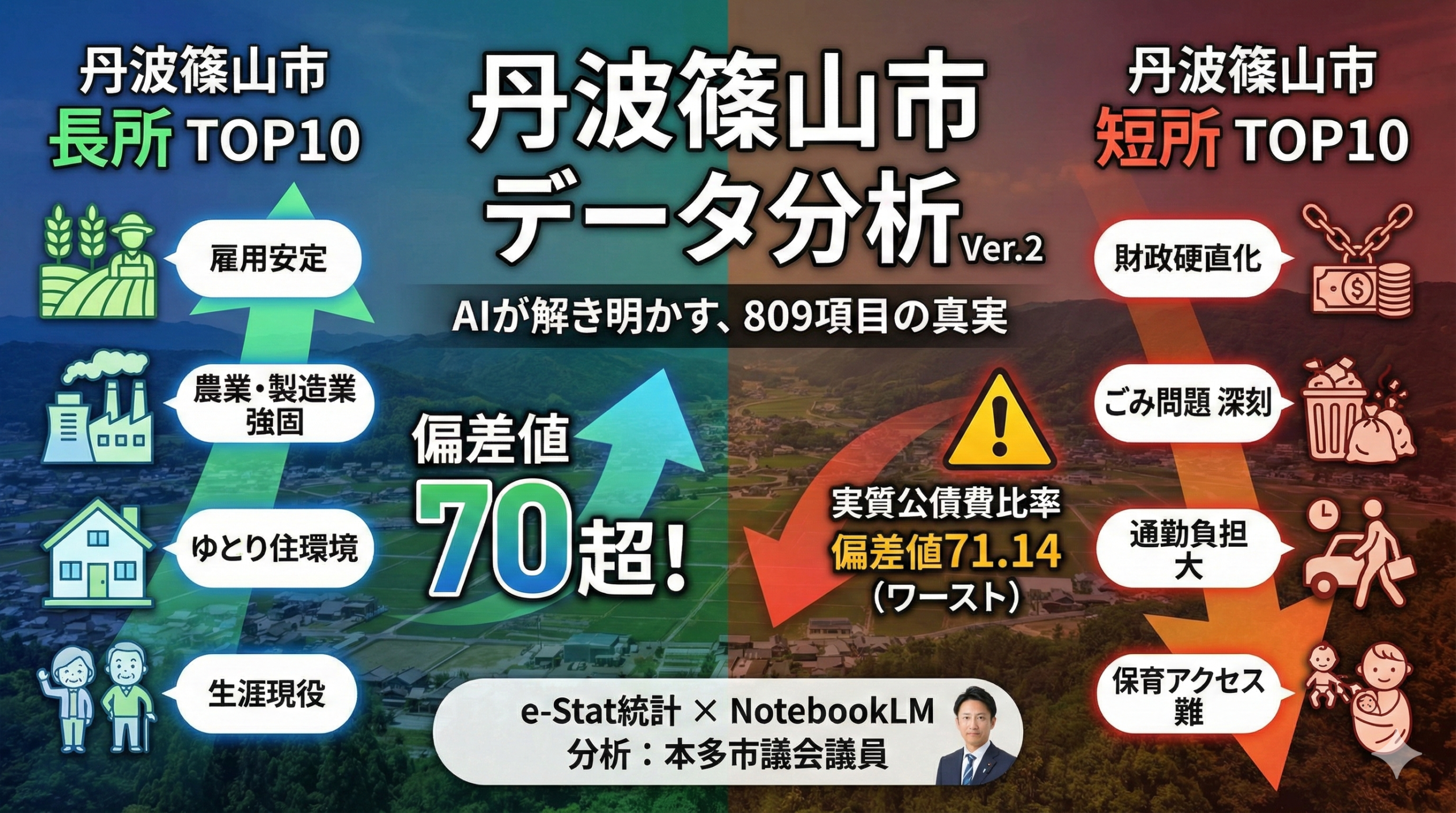 ここまで挙げた3つの要素はすべて、データに基づいて分析した丹波篠山市の「良いところ」と「悪いところ」から導き出したものです。AIやIT、データ分析を活用することにより、未来を予測し、合理的な政策(EBPM)を実現することができる未来をつくります。